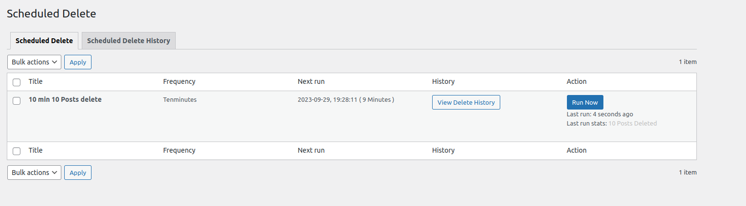 You can view a list of all scheduled deletes by clicking on “WP Bulk Delete” > “Schedule Delete” in the menu. Each scheduled delete entry displays the next run time, most recent delete, and the number of deleted records.