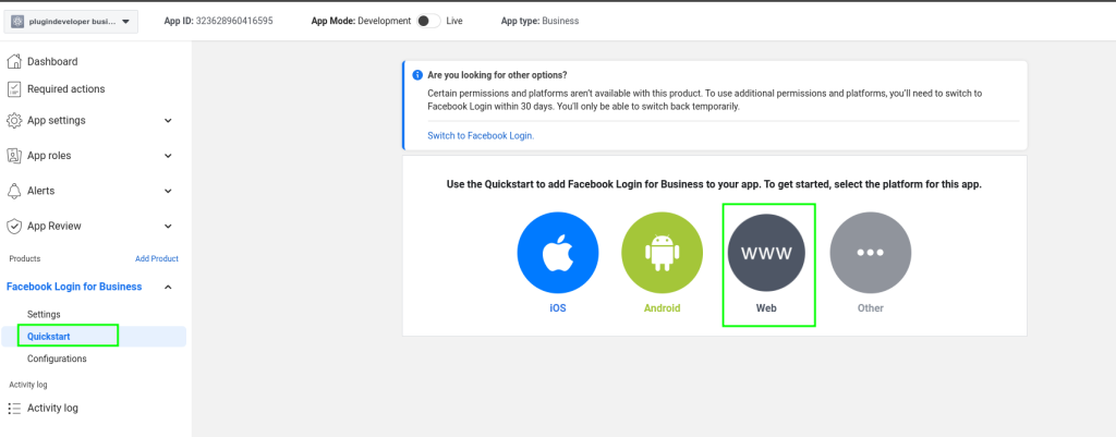 It will take you to the Facebook app dashboard. Now you need to add Facebook Login into your Facebook App. Select “Facebook Login for Business” and go ahead. You can add by clicking on Product+ too.