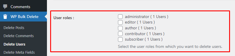 • Choose User Roles: Under “Delete Users,” you’ll find options for various user roles. Select the roles of the users you wish to remove, whether it’s subscribers, contributors.