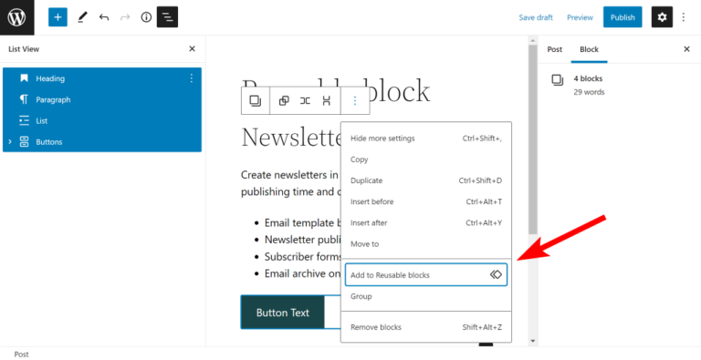If you frequently use the same content (e.g., call-to-action buttons, disclaimers), you can save time by creating a Reusable Block: