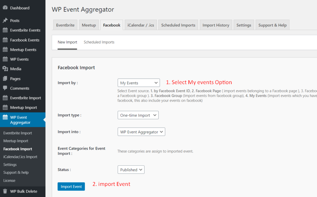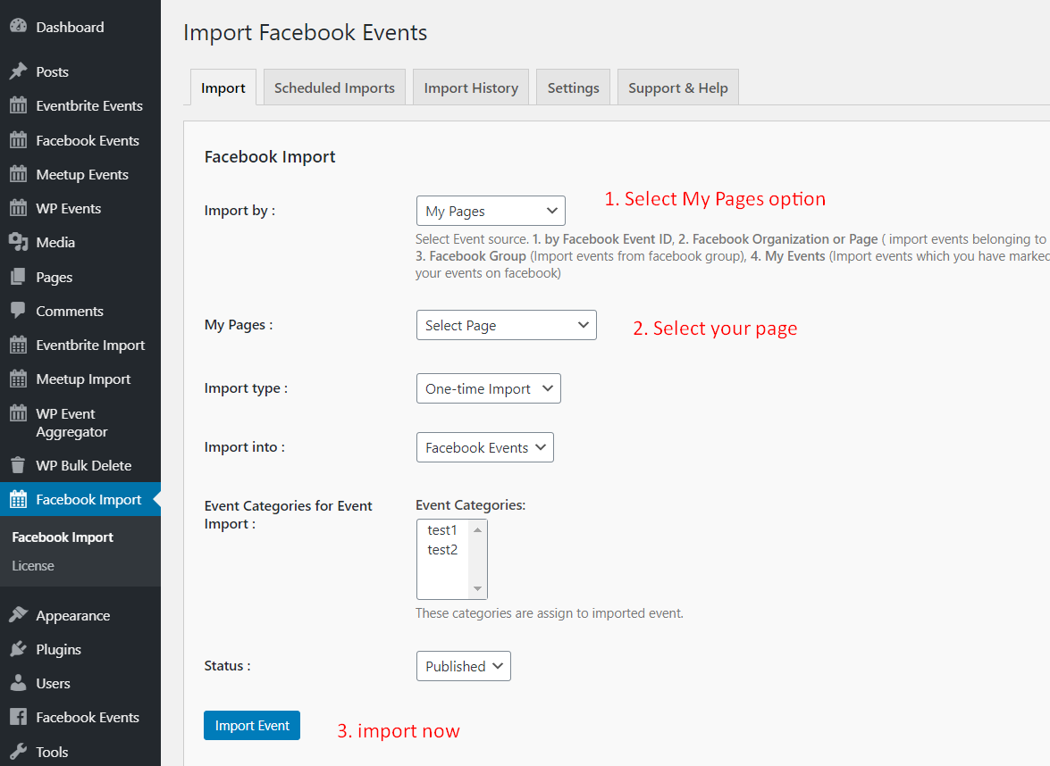 You can import using Facebook Page ID from pages listed in plugin under My Pages list once you have authorized the app. It gives the list of pages you own. For other pages, you need to use the “My Event” option to import events. (for WP Event Aggregator you can import events by your page id)