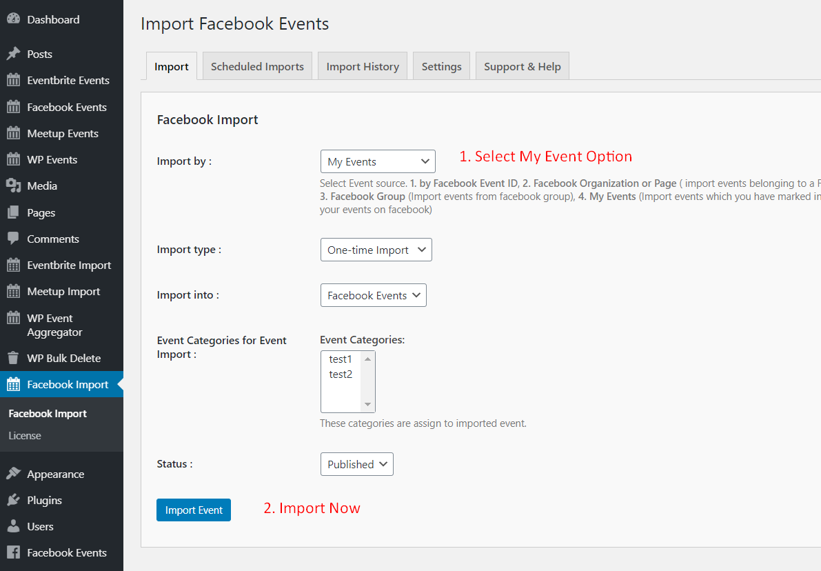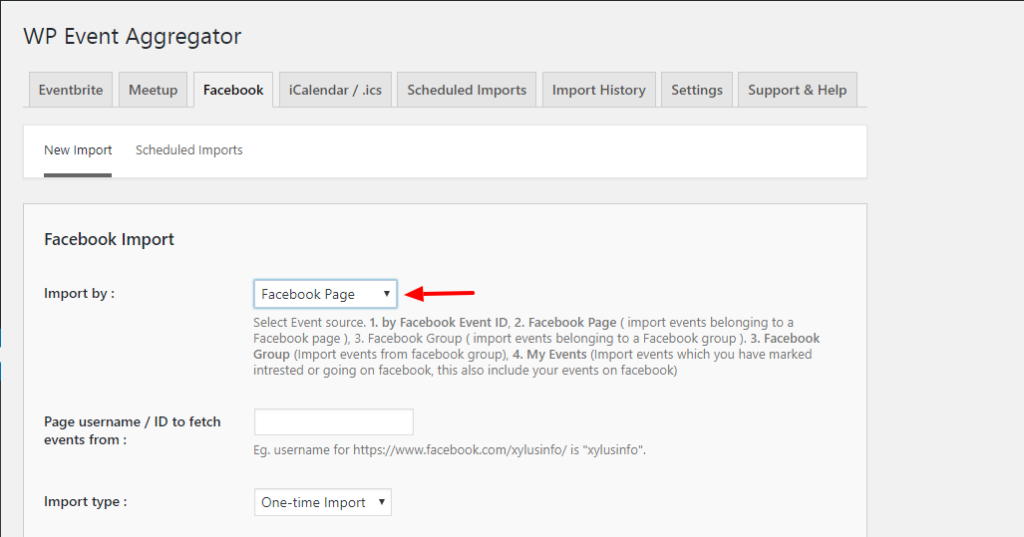 Facebook pages: You can use your own Facebook page id to import events from that page. You can not import events from other public page’s event by page id.